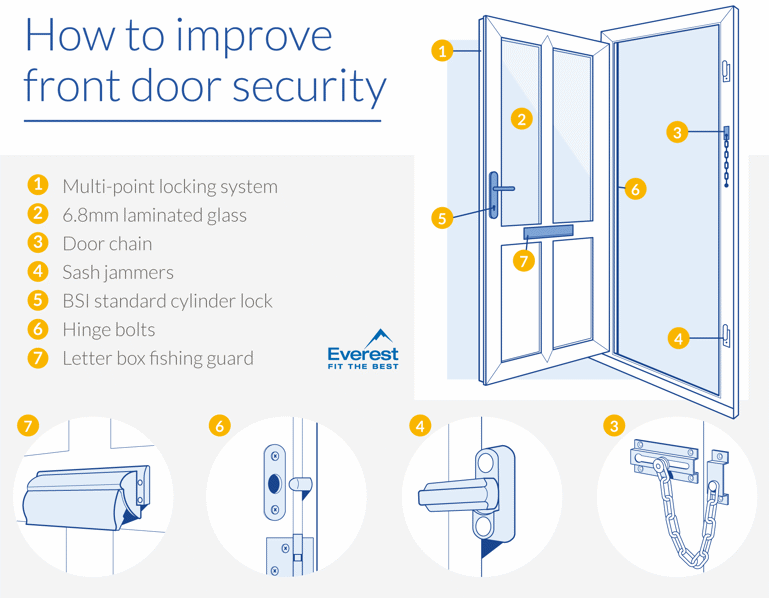Everest does not supply sash jammers or hinge bolts. Letterbox fishing guards and door chains are an optional extra.