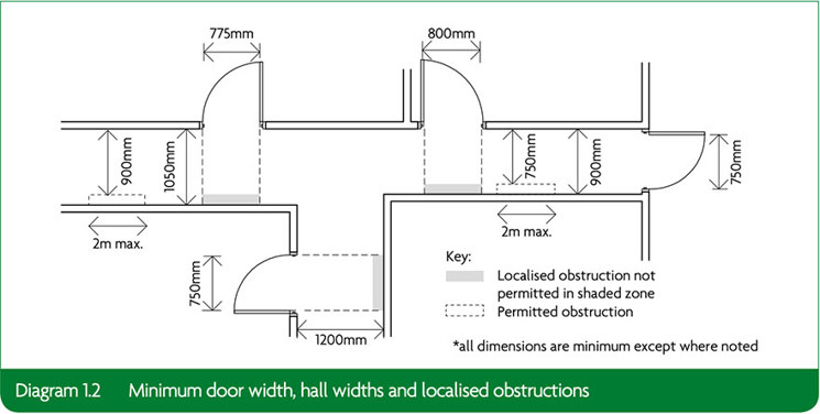 To allow for wheelchair access (in a visitable dwelling), internal doors must have a minimum clear opening of 750mm.