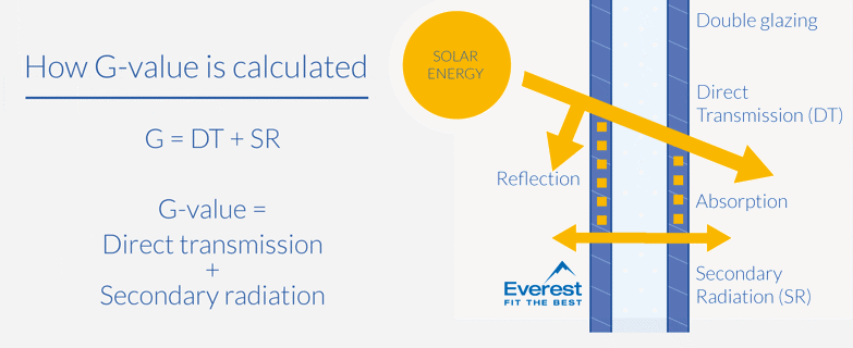 G-value is calculated from the direct energy transmitted through the glass plus the energy absorbed by the material and radiated internally into an enclosed space.