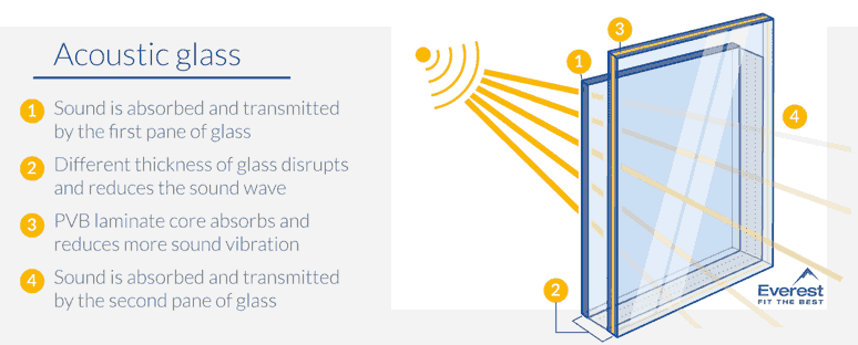 Acoustic glass, also known as soundproof glass, or noise reduction glass is specialist glass installed in noise reduction windows that can reduce the amount of noise that is transmitted through the glass and a window (or door).